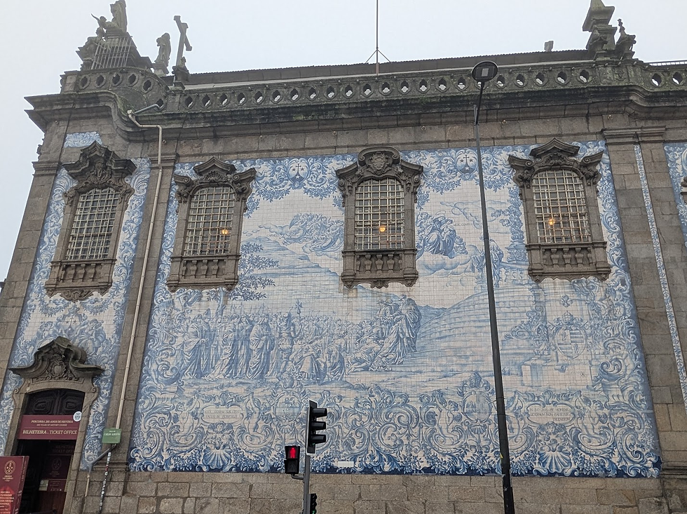We came to Porto on the recommendation of friends who visited in September. We chose February because it's off season, not so crowded, and generally pretty nice weather with temperatures in the 50s and 60s. It just so happened that we came in the middle of a stormy period. Just like in Devon, many roads are flooded and the high winds and rain make it pretty miserable but we were determined to get out and see as much as we could. In Porto, that generally means churches and tiles. Tiles have a long history in Porto (and Portugal in general) and reflect influences of Moorish and Dutch tile making. The 18th century marked the "Golden Age," featuring large, detailed, narrative panels on churches.